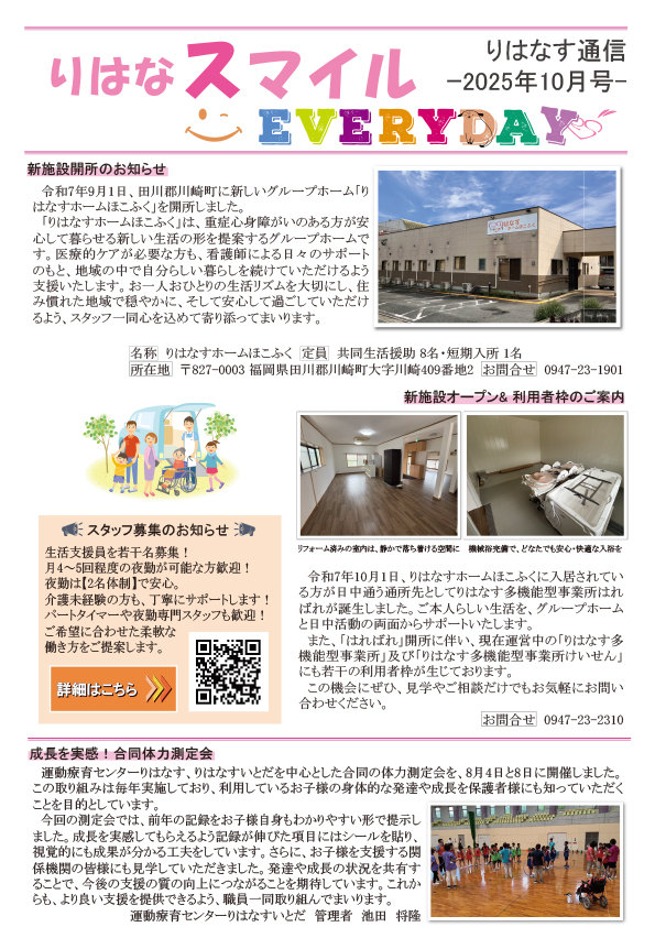 りはなす通信は、リハナスが提供するサービスや日々の取り組みを、利用者の皆さまや関係機関の方々にわかりやすくお伝えする広報誌です。