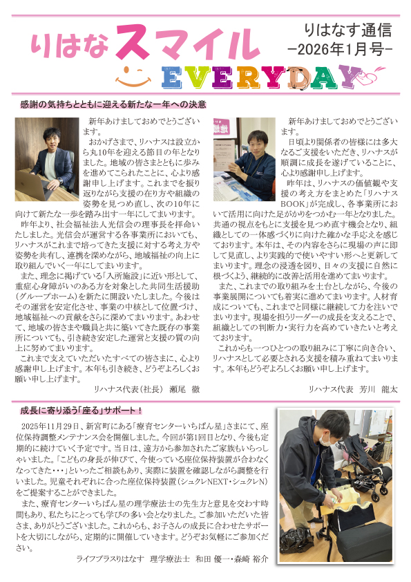 りはなす通信は、リハナスが提供するサービスや日々の取り組みを、利用者の皆さまや関係機関の方々にわかりやすくお伝えする広報誌です。